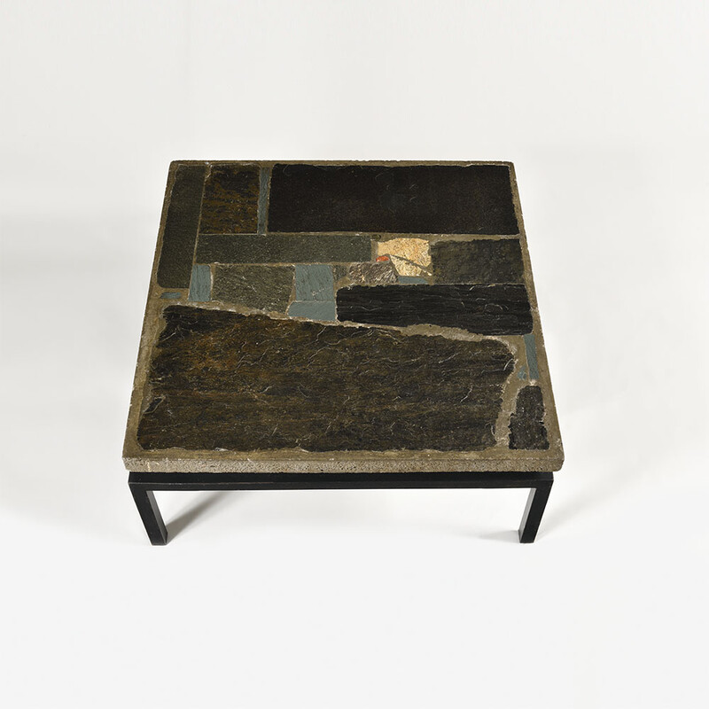 Coffee table with a concrete top, inlaid with stone slabs and raw black and blue-grey slate.