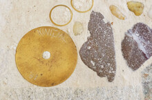 round coffee table, white concrete top, with white and beige slabs stone, pebbles, bricks and steel pieces inlaid. round white painted iron base.