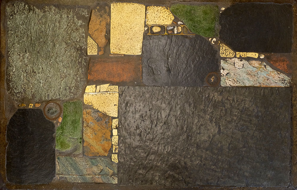 large coffee table, concrete varnished top, with blue/grey slate, black raw slate slab, steel piece,