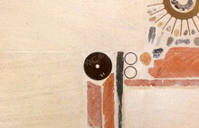 round coffee table, white concrete top, with white and beige slabs stone, pebbles, bricks and steel pieces inlayed. round white painted iron base.