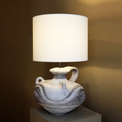 A huge table lamp made of stoneware covered with a white enamel revealing a stylistic decoration.