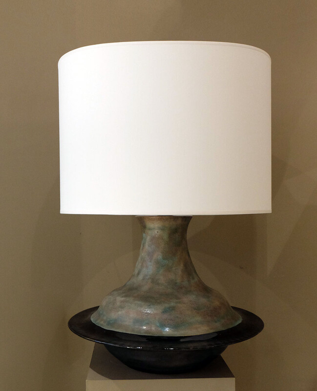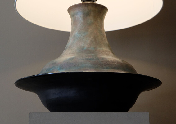 A huge table lamp in shape of a spinning top made of manganese blue grey ceramic and deep bright black ring frieze on the edge.