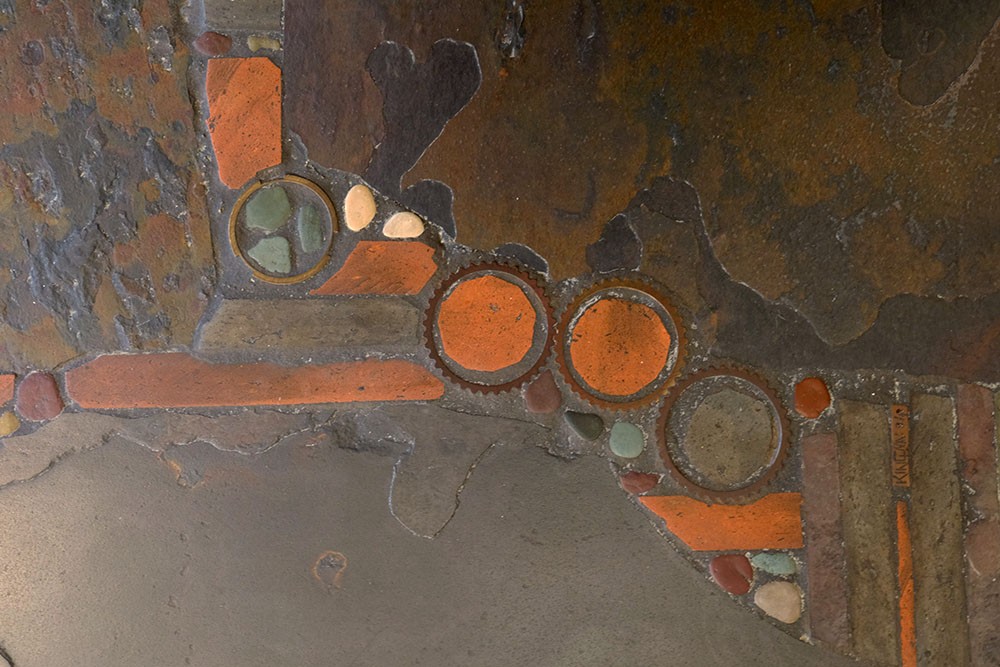 amazing coffee table concrete circular top, with black and turquoise stone slices, slate, pebbles, bricks, steel pieces inlayed.