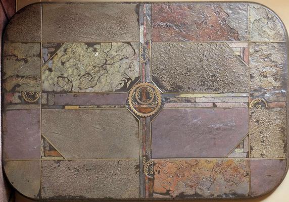 coffee table concrete varnished top, with stones and steel pieces inlayed. black painted iron base.