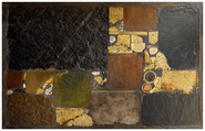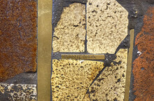 large coffee table, concrete varnished top, with slate, gilt brass piece, beige colored stone, green ceramic piece and bricks inlayed.