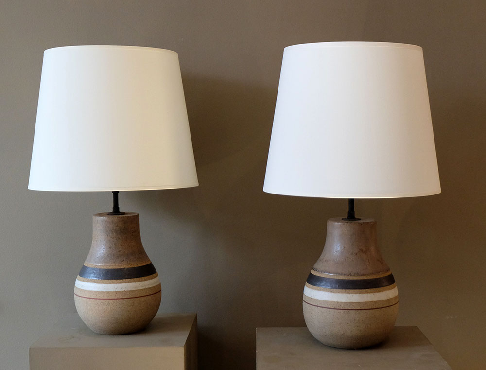 a pair of table lamps made of ocher ceramic with colored strips earth color, ocher, white and red thread.