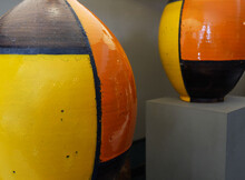 Pair of very large ovoid table lamps in glazed ceramic, in shades of yellow, orange, and brown.