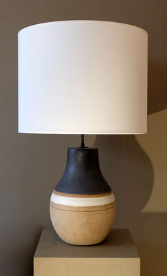 a big table lamp made of ocher ceramic with black enameled decoration on the top, a white enameled strip and a blood red color thread.