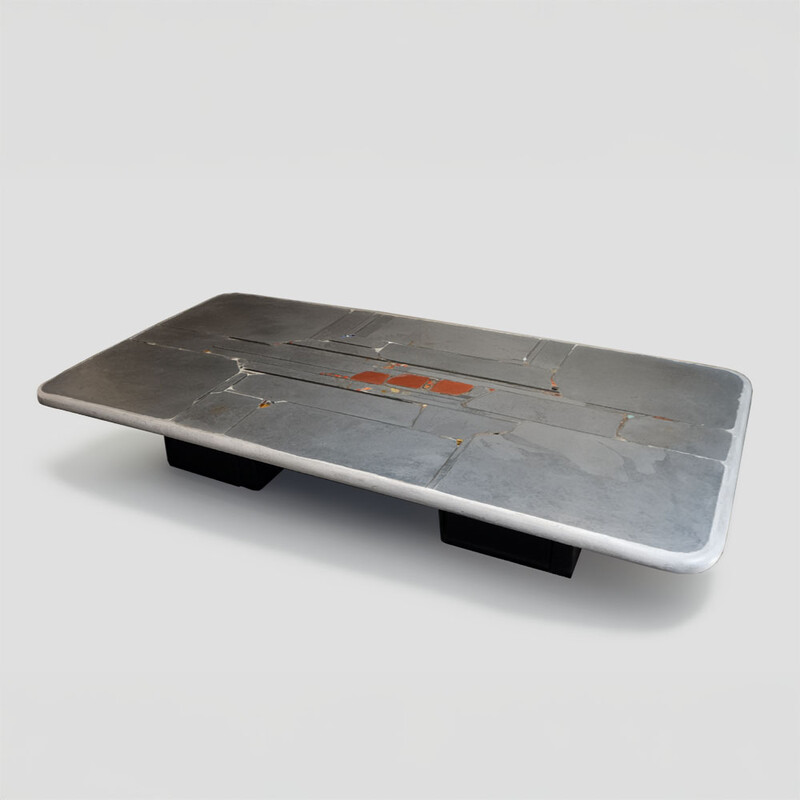 Imposante table basse — ou table de salle à manger — dotée d’un plateau rectangulaire en béton incrusté de tranches d’ardoise bleu-gris, de trois éléments en brique au centre, de pierres de turquoise et de jaspe rouge, de fragments d’ardoise noire, ainsi que de pièces en cuivre et en acier.